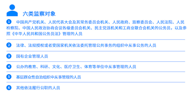 監察法第十五條規定六類監察對象,實現對所有行使公權力的公職人員監督全覆蓋。