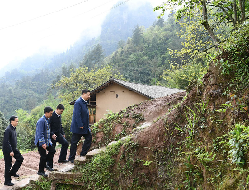 ????這是4月15日下午,在石柱土家族自治縣中益鄉華溪村,習近平踏著濕滑的石階登上陡坡,前往貧困戶譚登周家看望。 新華社記者 謝環馳 攝