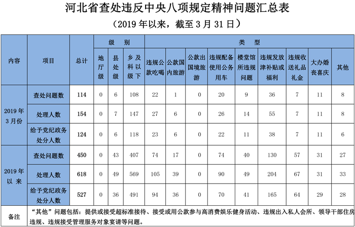 2019年3月,我省查處違反中央八項規定精神問題114件,處理154人,給予黨紀政務處分124人。截至3月31日,我省查處違反中央八項規定精神問題情況如下: