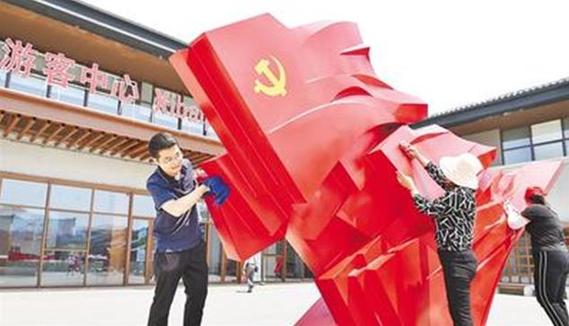 6月11日,平山縣西柏坡紅旅小鎮上,青年黨員和村民們一起擦拭游客中心門前的黨旗雕塑。記者 趙 杰攝