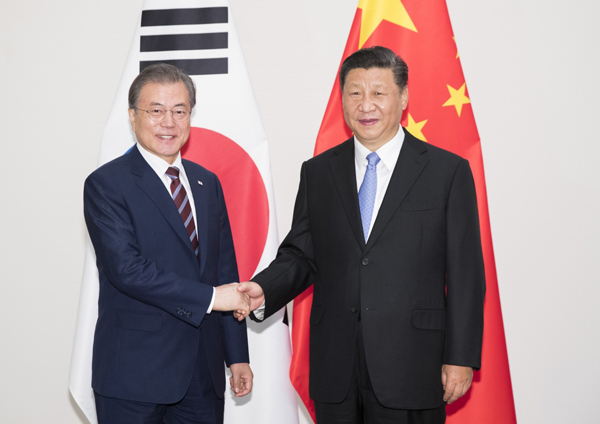 文在寅表示,在我和習近平主席共同引領下,韓中關系發展勢頭喜人。韓方愿同中方加強高層交往,推進各領域對話合作,盡快完成韓中自由貿易協定第二階段談判,將韓中關系提升到新的水平。韓方愿同中方共建“一帶一路”,合作拓展第三方市場。韓方愿同中方一道,維護多邊主義、自由貿易和開放型世界經濟,這對韓國利益攸關。