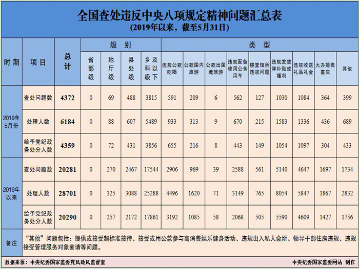 為掌握全國貫徹落實中央八項規定精神情況,中央紀委在各省區市和新疆生產建設兵團、各中央和國家機關、各中央企業和中央金融企業等建立了落實中央八項規定精神情況月報制度。2019年以來,截至5月31日,全國查處違反中央八項規定精神問題情況如下: