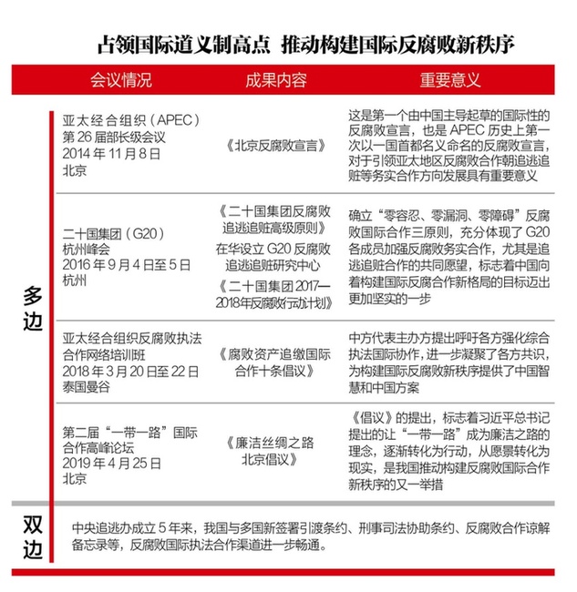 三是深化國際合作,構建國際反腐敗新秩序。堅持以元首外交為引領,充分利用重大多邊外交場合,凝聚各方共識,積極參與制定相關規則,為全球反腐敗治理貢獻中國智慧和中國方案。推動聯合國、二十國集團、亞太經合組織等建立反腐敗合作機制,主導制定亞太經合組織《北京反腐敗宣言》、二十國集團《反腐敗追逃追贓高級原則》,確立以“零容忍、零漏洞、零障礙”為主要內容的10條原則,設立二十國集團反腐敗追逃追贓研究中心,提出亞太經合組織《腐敗資產追繳國際合作十條倡議》,發起《廉潔絲綢之路北京倡議》,健全反腐敗執法多邊合作網絡。與美國、加拿大、澳大利亞、新西蘭等國建立雙邊執法合作機制,與菲律賓、泰國等國反腐敗機構簽訂反腐敗合作諒解備忘錄,為追逃追贓工作爭取最廣泛的國際支持。