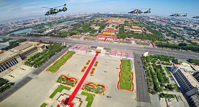 2015年9月3日,中國人民抗日戰爭暨世界反法西斯戰爭勝利70周年紀念大會在北京隆重舉行。這是航拍的直升機梯隊飛過天安門廣場。(資料圖片)