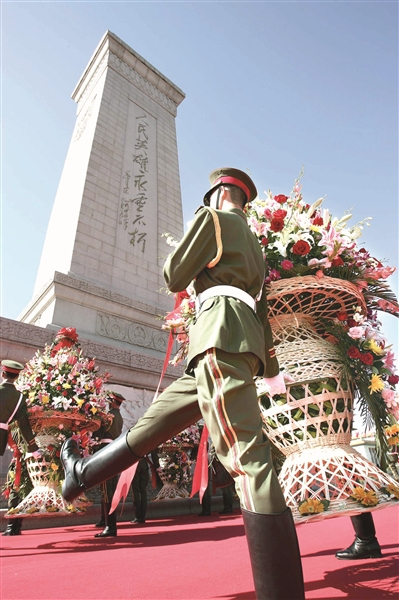在天安門廣場人民英雄紀念碑前舉行的向人民英雄敬獻花籃儀式。(資料圖片)