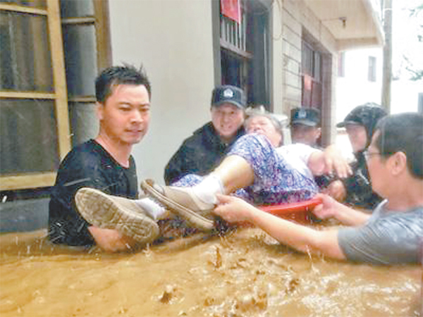 受臺風“利奇馬”影響,8月10日下午,安徽省寧國市寧墩鎮老街受到洪水侵襲,當地村干部和干警正在將一位被困家中的老人轉移到安全地帶。李曉紅 攝