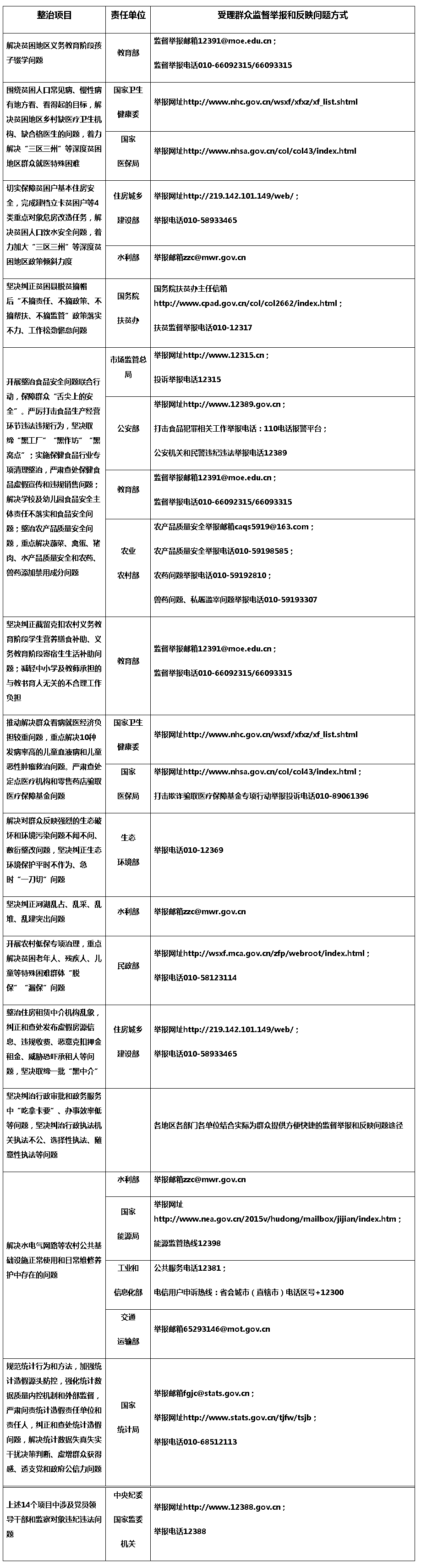 按照黨中央在“不忘初心、牢記使命”主題教育中開展專項整治的要求,近日,中央紀委國家監委機關牽頭、會同15個中央國家機關制定了《在“不忘初心、牢記使命”主題教育中專項整治漠視侵害群眾利益問題的實施方案》,部署開展對4個方面14項突出問題的專項整治。此次專項整治聚焦扶貧領域腐敗和作風問題,聚焦教育醫療、環境保護、食品藥品安全等民生領域侵害群眾利益問題,聚焦發生在群眾身邊的不正之風和“微腐敗”問題,聚焦統計造假問題,著力解決群眾最關心最直接最現實的利益問題,不斷增強人民群眾的獲得感、幸福感、安全感。為方便群眾參與監督和反映問題,現將專項整治受理群眾監督舉報和反映問題方式公布如下。