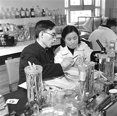 上世紀50年代,在中醫研究院中藥研究所任研究實習員的屠呦呦(前右)與老師樓之岑一起研究中藥。(資料圖片)