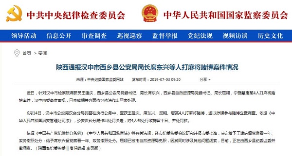 2019年6月,陜西省漢中市檢察院調研員、西鄉縣檢察院原檢察長王建慶,西鄉縣公安局黨委書記、局長席東興,西鄉縣自然資源局黨委書記、局長屈翔因打麻將賭博被當地警方查獲。三人被行政拘留十日、并處罰款,此后又被給予留黨察看一年、政務撤職等處分。