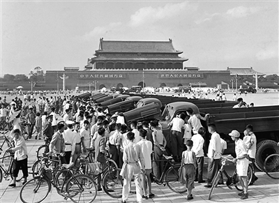 第一汽車制造廠制造出來的第一批38輛“解放牌”汽車,在1956年8月21日運到北京。這批汽車參加當年首都國慶節的檢閱和游行。 這是“解放牌”汽車停留在天安門廣場上,人們紛紛趕來參觀。