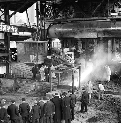 1953年3月11日,我國第一座自動化的煉鐵爐——鞍山鋼鐵公司第8號煉鐵爐開始出鐵了。鐵水經過化驗,質量很好。這是開始出鐵時,冶金部門的領導同志、蘇聯專家等正在參觀的情形。