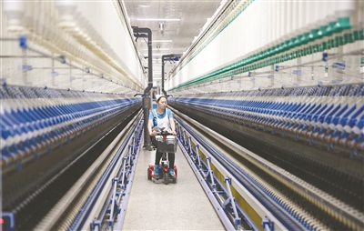 2019年1月11日,工人在山東鄒平市魏橋紡織公司智能化車間對生產線進行巡檢。魏橋紡織上線了“紡織+AI”人工智能車間,安裝了15萬個傳感器的生產線上,排列整齊的各色設備運轉有序,高科技改變了傳統生產模式。新華社記者 潘思危 攝