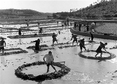1959年冬,湖南長沙縣金井人民公社認真貫徹農(nóng)業(yè)生產(chǎn)的“八字憲法”,抓緊冬修水利、積肥和深翻土地,為來年豐收打好基礎(chǔ)。這是公社社員正在田間漚肥。新華社記者 王平 攝