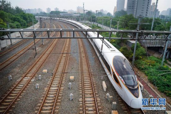 2018年7月1日,整備好的G7次列車駛向北京南站,準備發往上海。此列G7列車是從北京開出的首趟正式運營的長編組“復興號”動車組。 新華社記者 邢廣利 攝