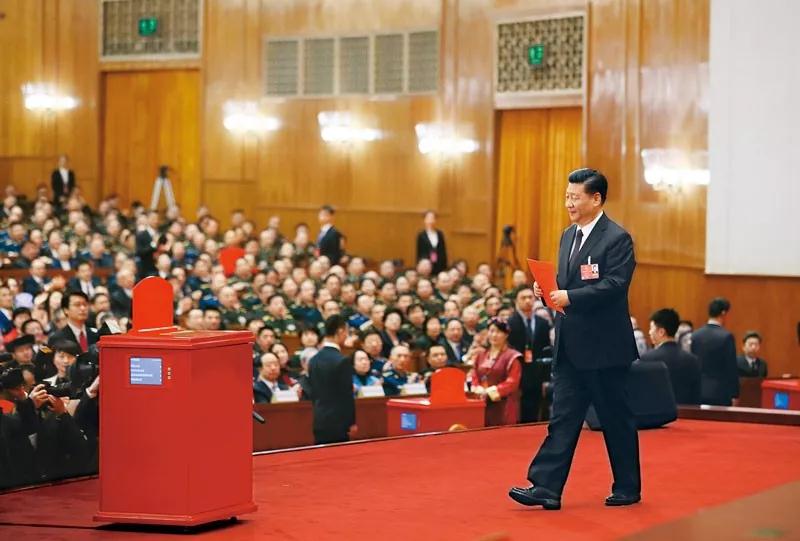 2018年3月17日,十三屆全國(guó)人大一次會(huì)議在北京人民大會(huì)堂舉行第五次全體會(huì)議。習(xí)近平當(dāng)選中華人民共和國(guó)主席、中華人民共和國(guó)中央軍事委員會(huì)主席。這是習(xí)近平準(zhǔn)備投票。新華社記者 蘭紅光/攝