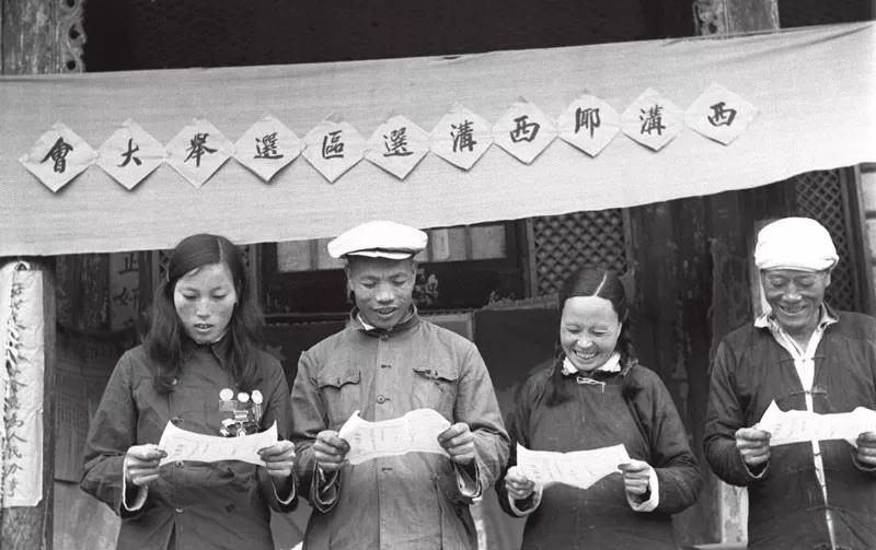 山西省平順縣西溝鄉(xiāng)西溝區(qū)在1953年9月27日舉行選舉大會(huì)。全國(guó)著名農(nóng)業(yè)勞動(dòng)模范李順達(dá)、申紀(jì)蘭被選為西溝鄉(xiāng)人民代表大會(huì)的代表。圖為在西溝區(qū)選舉大會(huì)上被選為代表的(自左起)申紀(jì)蘭、李順達(dá)、韓春蘭和張秋全在觀(guān)看當(dāng)選證書(shū)的情形。新華社記者 項(xiàng)化庚/攝