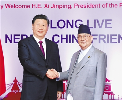 國家主席習近平13日在加德滿都同尼泊爾總理奧利會談。
