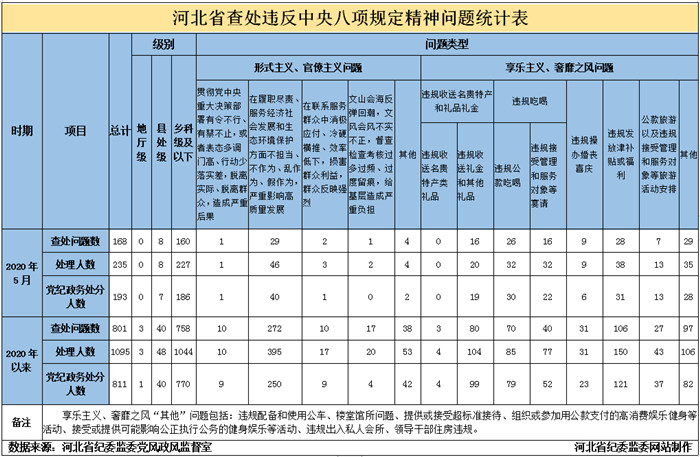 2020年5月,我省查處違反中央八項規定精神問題168件,處理235人,給予黨紀政務處分193人。截至5月31日,我省查處違反中央八項規定精神問題情況如下: