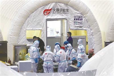 1月14日傍晚,河北省石家莊市河北體育館網(wǎng)球館內(nèi),一座座半圓柱體狀的白色氣膜實(shí)驗(yàn)室排布開(kāi)來(lái),實(shí)驗(yàn)室門(mén)簾位置上“火眼實(shí)驗(yàn)室”五個(gè)大字以及鮮紅的“火眼”圖標(biāo)格外醒目,實(shí)驗(yàn)室內(nèi)燈光明亮,檢測(cè)人員緊鑼密鼓地進(jìn)行樣本取樣、核酸提取、核酸擴(kuò)增等工作。