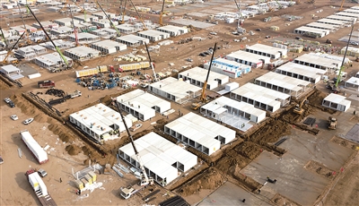 基建部分完工后,3000套集成房屋將在硬化的場地上迅速拼裝到位。13日晚間,首批600套集成房屋從河北唐山運抵現場。在零下10℃左右的嚴寒里,工人們戴上耳罩,又迅速投入到房屋拼裝工作中。