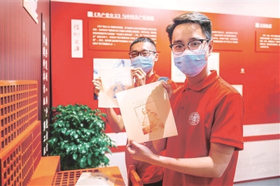 1920年,復旦大學老校長陳望道翻譯首個中文全譯本《共產黨宣言》。2018年5月,復旦大學修繕了陳望道舊居,以“信仰之源”為主題打造《共產黨宣言》展示館,融宣傳教育、社會實踐、學術培養為一體。一批復旦青年師生黨員自發追尋“真理的味道”,組建了黨員志愿服務隊,面向廣大師生和社會各界開展宣講活動。圖為志愿服務隊隊員在展示《共產黨宣言》陳望道譯本首版和第二版的復制封面紀念品。(資料圖片)