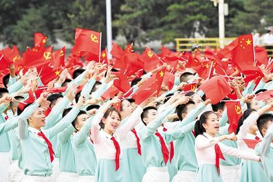 “請黨放心、強國有我”,天安門廣場上共青團員和少先隊員代表向黨抒發錚錚誓言。