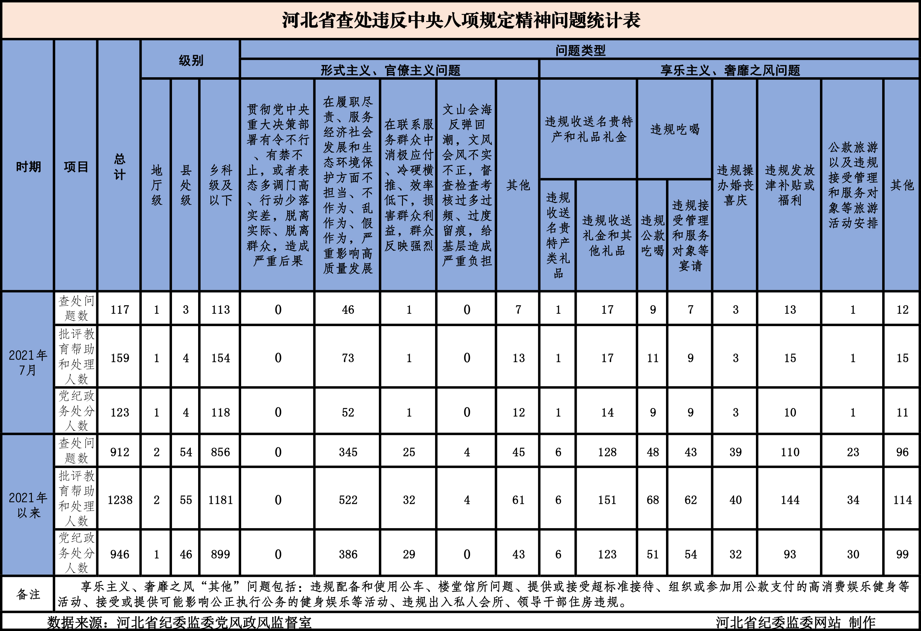 2021年7月,全省各級紀(jì)檢監(jiān)察機(jī)關(guān)共查處違反中央八項(xiàng)規(guī)定精神問題117起,批評教育幫助和處理159人,其中黨紀(jì)政務(wù)處分123人。