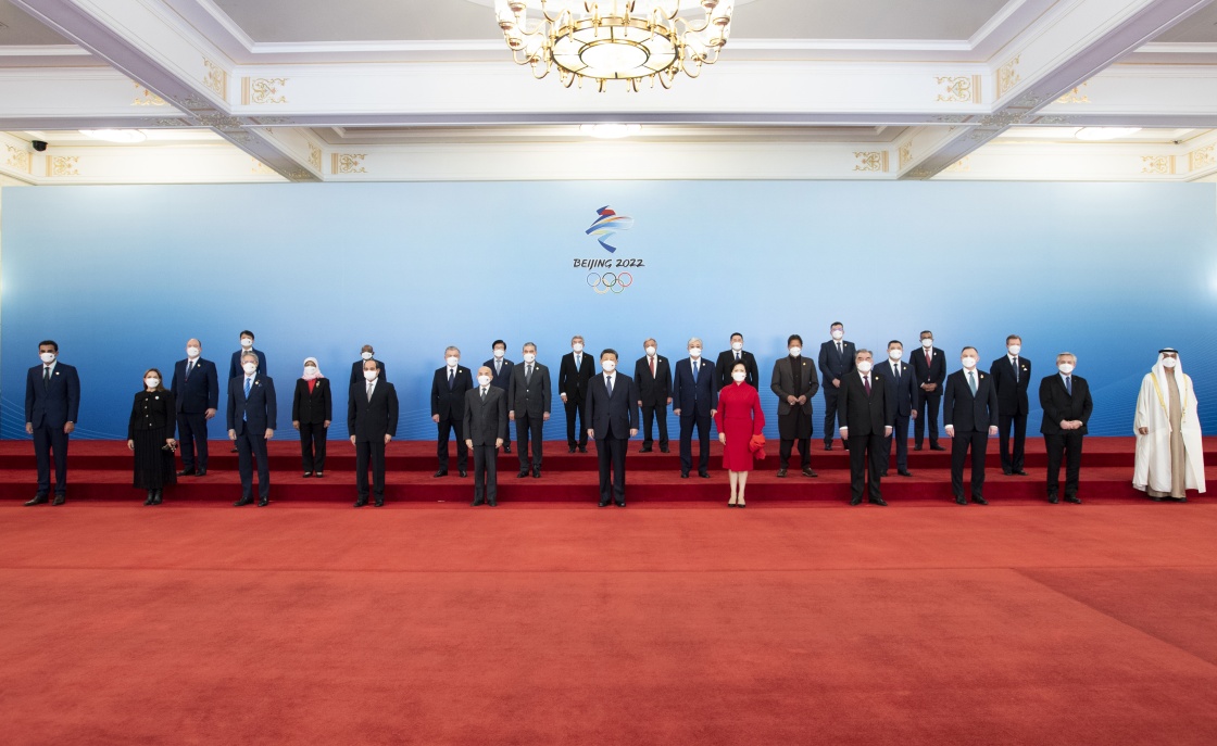 2月5日中午,國(guó)家主席習(xí)近平和夫人彭麗媛在北京人民大會(huì)堂金色大廳舉行宴會(huì),歡迎出席北京2022年冬奧會(huì)開(kāi)幕式的國(guó)際貴賓。這是習(xí)近平和彭麗媛同國(guó)際貴賓一起合影留念。新華社記者 謝環(huán)馳 攝
