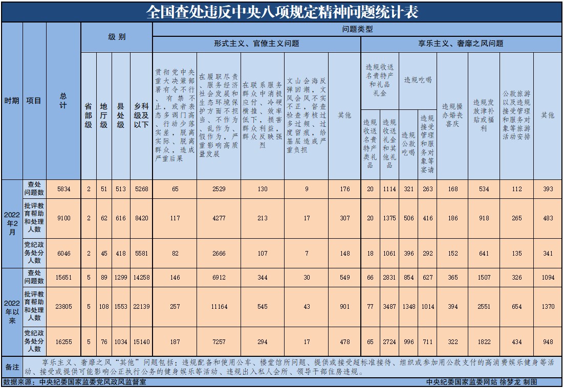 3月27日,中央紀(jì)委國(guó)家監(jiān)委公布了2022年2月全國(guó)查處違反中央八項(xiàng)規(guī)定精神問(wèn)題匯總情況。當(dāng)月,全國(guó)共查處違反中央八項(xiàng)規(guī)定精神問(wèn)題5834起,批評(píng)教育幫助和處理9100人,其中,黨紀(jì)政務(wù)處分6046人。這是中央紀(jì)委國(guó)家監(jiān)委連續(xù)第102個(gè)月公布月報(bào)數(shù)據(jù)。