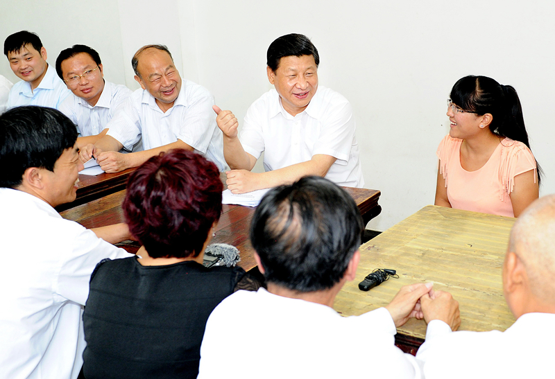 2013年7月11日至12日,中共中央總書記、國家主席、中央軍委主席習近平在河北省調研指導黨的群眾路線教育實踐活動。這是習近平在正定縣塔元莊村社區綜合服務中心看望鎮村干部和村民。 新華社記者 李 濤攝