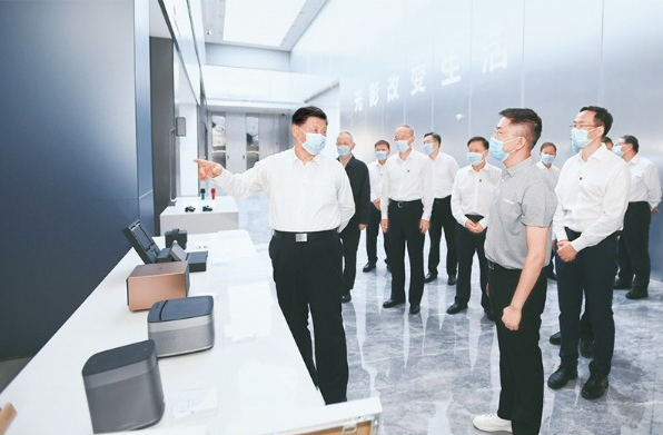 2022年6月8日,中共中央總書記、國家主席、中央軍委主席習近平在四川考察。這是8日下午,習近平在宜賓市極米光電有限公司考察,了解企業自主創新和產品研發銷售情況。 新華社記者 謝環馳/攝