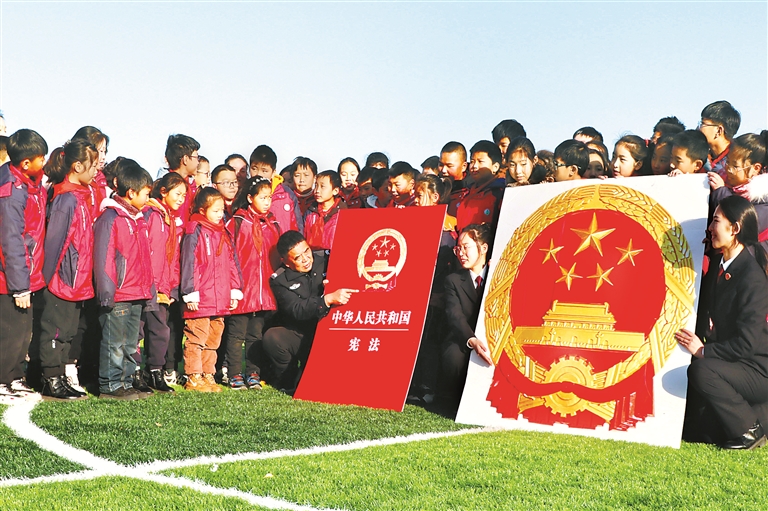 2014年11月1日,十二屆全國人大常委會第十一次會議表決通過決定,將12月4日設立為“國家憲法日”。圖為2021年12月3日,江蘇省連云港市灌云縣檢察院、司法局工作人員到該縣洋橋小學開展憲法宣傳活動。 (圖片來源:人民視覺)