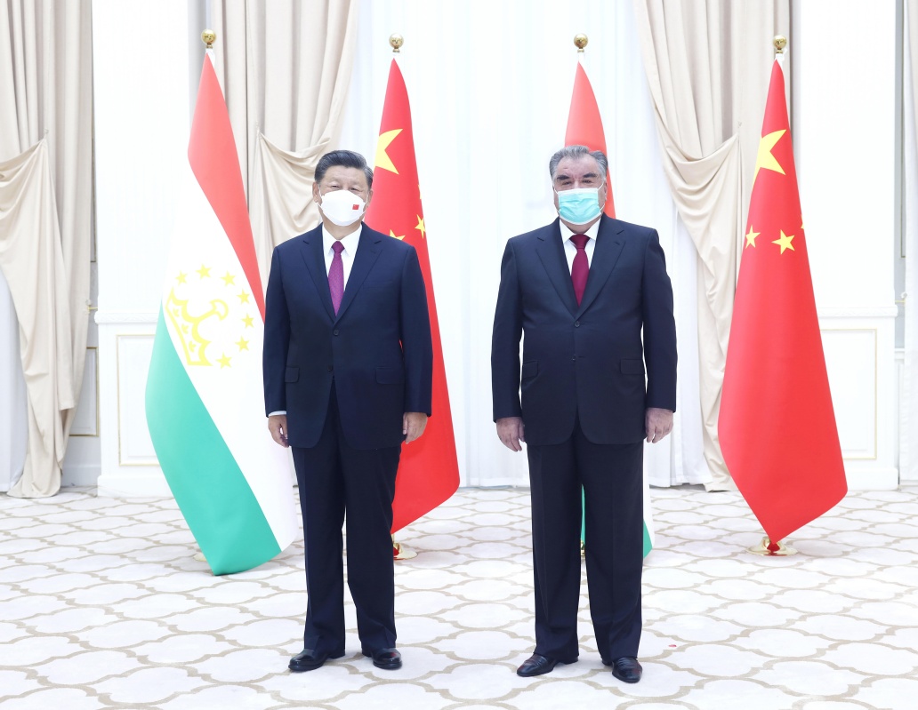 當地時間15日上午,國家主席習近平在撒馬爾罕國賓館會見塔吉克斯坦總統拉赫蒙。