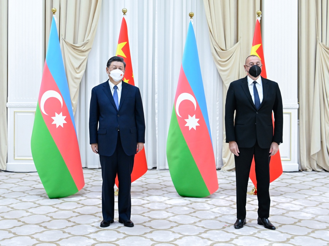 當地時間15日下午,國家主席習近平在撒馬爾罕國賓館會見阿塞拜疆總統阿利耶夫。