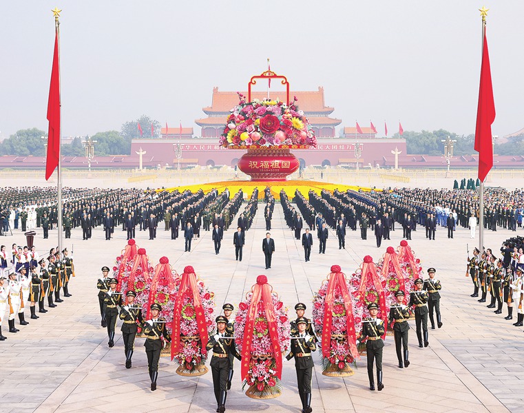 9月30日上午,黨和國家領導人習近平、李克強、栗戰書、汪洋、王滬寧、趙樂際、韓正、王岐山等來到北京天安門廣場,出席烈士紀念日向人民英雄敬獻花籃儀式。 新華社記者 黃敬文 攝