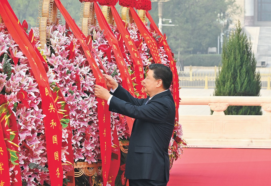 9月30日上午,黨和國家領導人習近平、李克強、栗戰書、汪洋、王滬寧、趙樂際、韓正、王岐山等來到北京天安門廣場,出席烈士紀念日向人民英雄敬獻花籃儀式。這是習近平整理花籃上的緞帶。 新華社記者 殷博古 攝