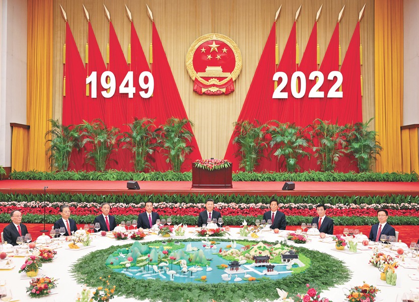 人民大會堂宴會廳華燈璀璨、鮮花綻放,洋溢著喜慶熱烈的節日氣氛。主席臺上方,莊嚴的國徽高懸,“1949-2022”的大字年號在鮮艷的紅旗映襯下格外醒目。