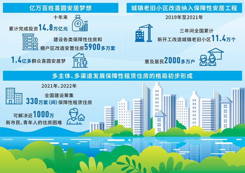 民以居為安。黨的十八大以來,我國進(jìn)入歷史上保障性安居工程規(guī)模最大、投資最多的建設(shè)時(shí)期,累計(jì)完成投資14.8萬億元,建設(shè)各類保障性住房和棚戶區(qū)改造安置住房5900多萬套,低保、低收入住房困難家庭基本實(shí)現(xiàn)應(yīng)保盡保,1.4億多群眾喜圓安居夢。
