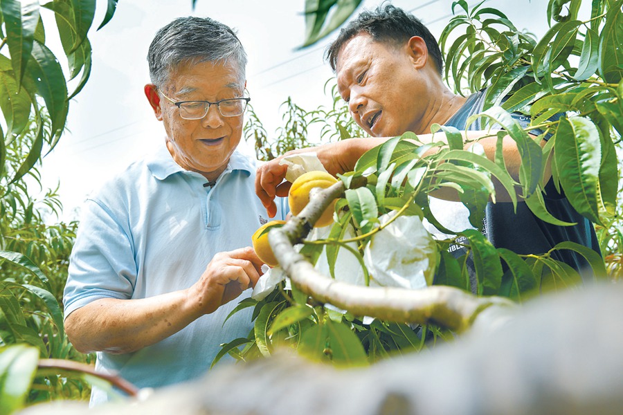 趙亞夫(左)在江蘇省句容市天王鎮戴莊村一處農業合作社查看果樹生長情況(2022年9月9日攝)。 新華社記者 李博 攝