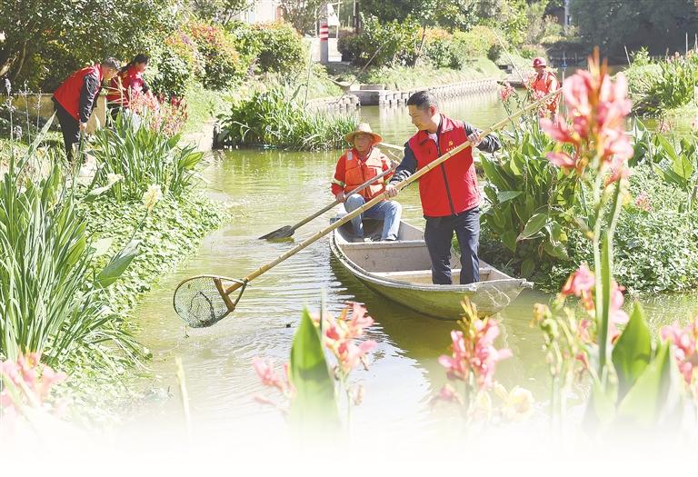 近年來,浙江省湖州市扎實推進美麗鄉村精品村創建。圖為2022年10月19日,德清縣乾元鎮齊星村,鎮村黨員河長和保潔員在清理河道漂浮物。