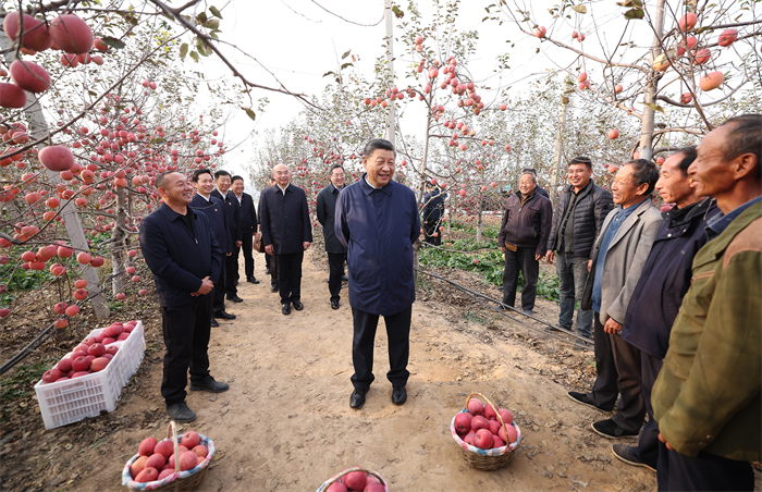 10月26日至28日,中共中央總書記、國家主席、中央軍委主席習近平在陜西省延安市、河南省安陽市考察。這是26日下午,習近平在延安市安塞區高橋鎮南溝村蘋果園同老鄉們親切交流。 新華社記者 鞠鵬 攝