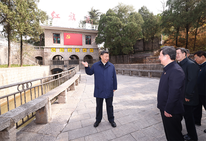 10月26日至28日,中共中央總書記、國家主席、中央軍委主席習近平在陜西省延安市、河南省安陽市考察。這是28日上午,習近平在安陽林州市實地察看紅旗渠分水閘運行情況。 新華社記者 鞠鵬 攝
