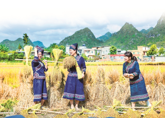 2022年10月23日,廣西壯族自治區(qū)百色市德保縣村民歡聚慶豐收,展示壯家稻作“那”文化。(圖片來(lái)源:視覺中國(guó))