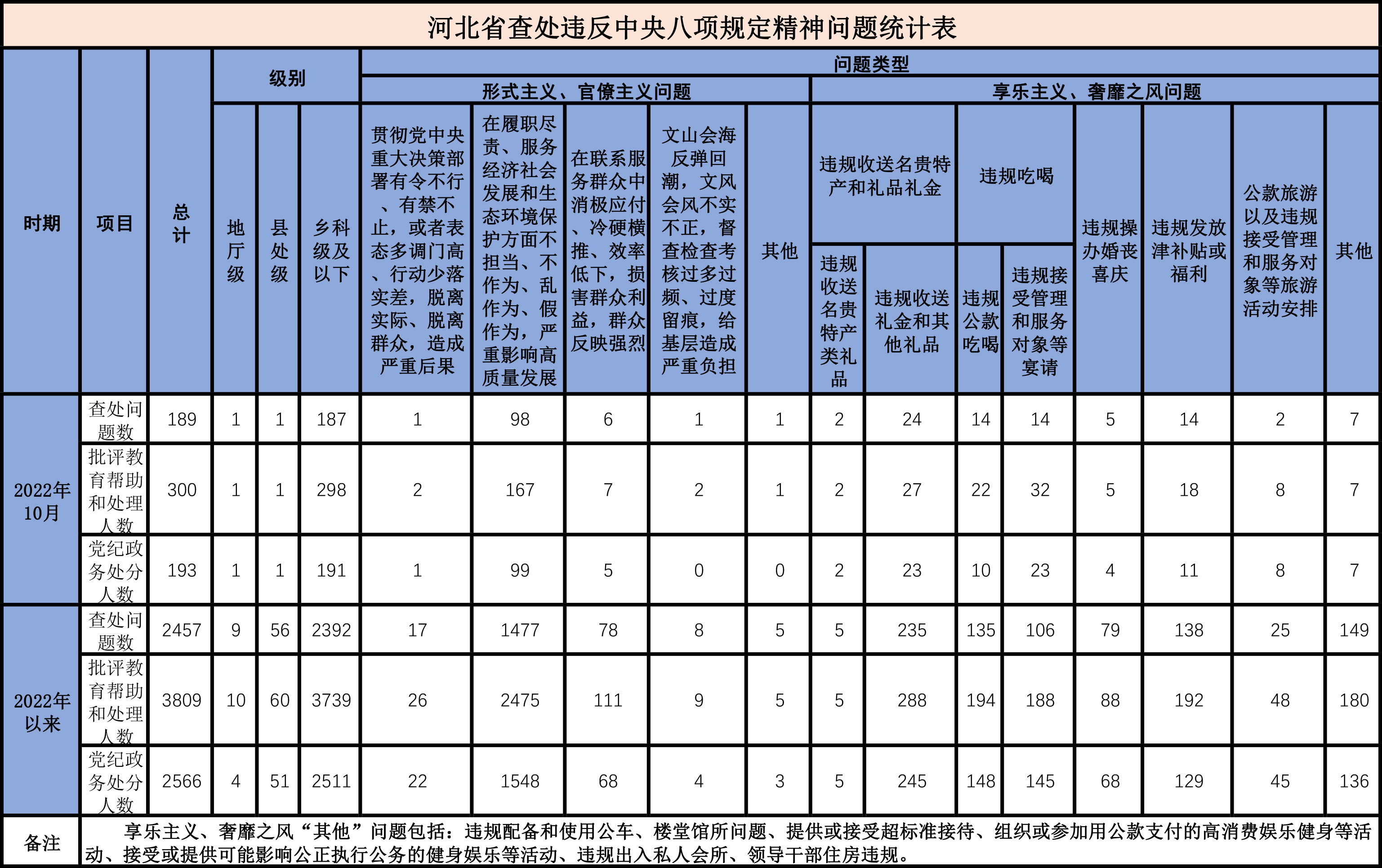 2022年10月,全省各級紀(jì)檢監(jiān)察機(jī)關(guān)共查處違反中央八項(xiàng)規(guī)定精神問題189起,批評教育幫助和處理300人,其中黨紀(jì)政務(wù)處分193人。
