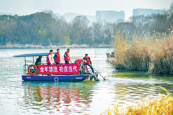 1月30日,浙江省湖州市長(zhǎng)興縣大蕩漾村外太湖支流水域,當(dāng)?shù)攸h員干部、河長(zhǎng)、鄉(xiāng)賢和青年志愿者共同參與禁漁巡查和河岸清理保潔。(圖片來源:視覺中國(guó))