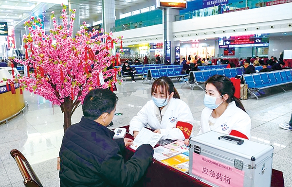 下圖:3月1日,在重慶北站北廣場(重慶火車站下轄車站)候車室內,“學雷鋒志愿服務隊”成員在為旅客提供義診服務。新華社記者 劉潺 攝