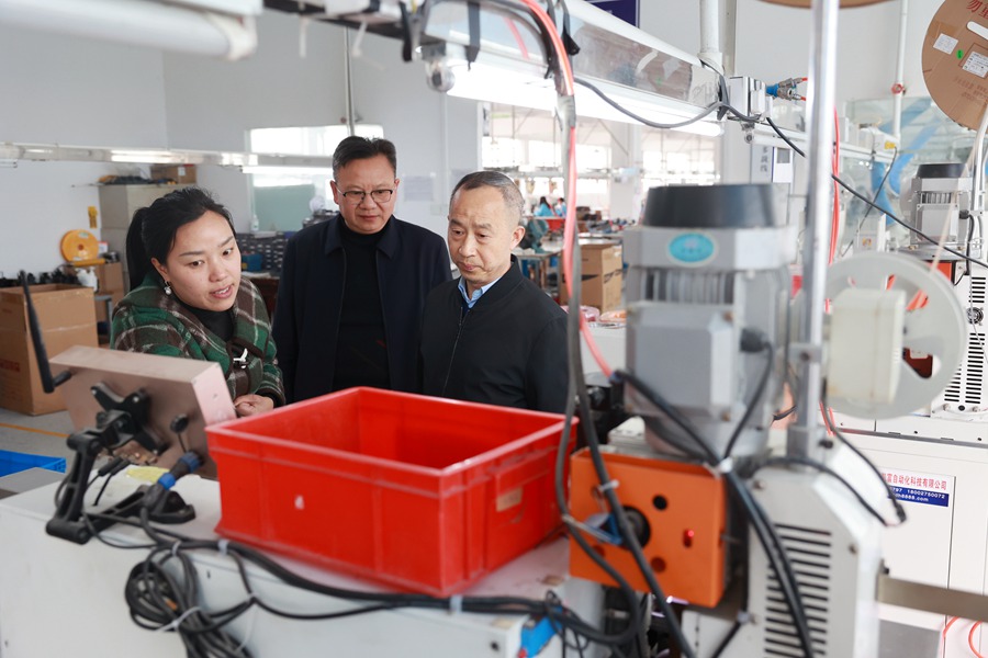 圖為汪名南(右)在岳西經濟開發區某企業調研,了解相關部門服務企業情況。朱曉林 攝
