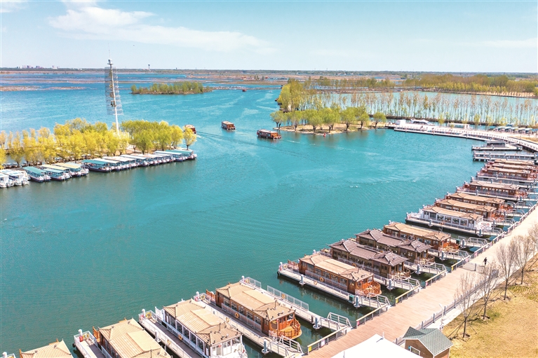 圖為河北雄安新區白洋淀旅游碼頭,堤綠水藍,生態環境保護成效顯著。 圖片來源:視覺中國