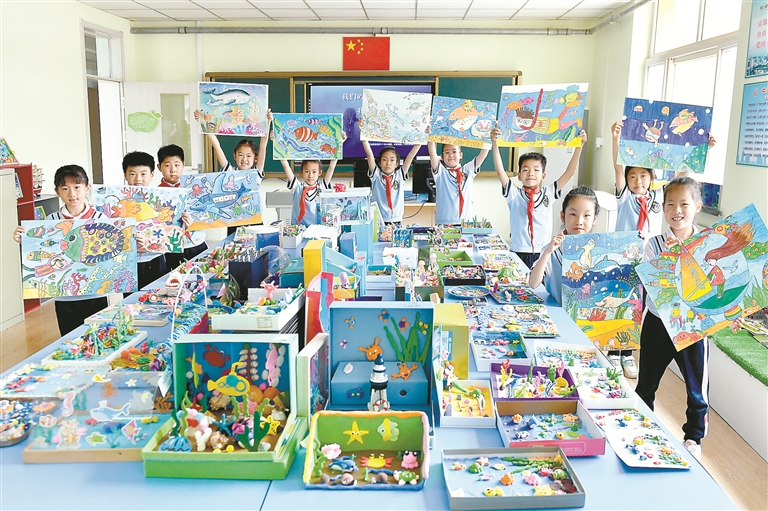 6月7日,山東省青島市壽光路小學開展“保護海洋環境”主題教育活動,學生們展示自己的“海洋家園”太空泥塑和繪畫作品。圖片來源:視覺中國