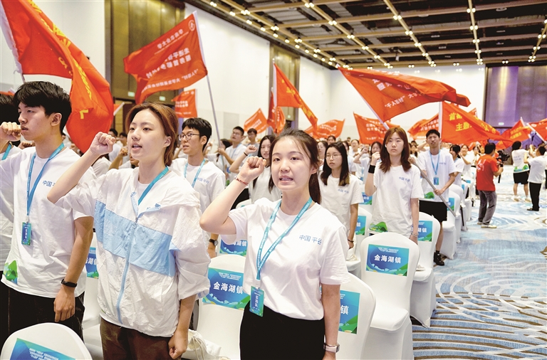 7月13日,北京市平谷區金海湖國際會展中心,首都高校“大思政課”主題實踐活動暨“走進平谷農業中關村 服務首都鄉村振興”“千人百村”大學生暑期社會實踐活動啟動儀式上,大學生們正在宣誓。圖片來源:視覺中國